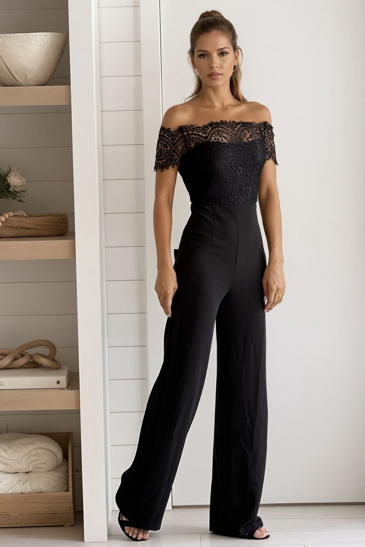 HOW STUNNING! This Black Lace Off Shoulder Knit Jumpsuit is now available at Saved by the Dress! Featuring a sexy lace top and solid black bottoms, this jumpsuit will surely turn heads at your next party!