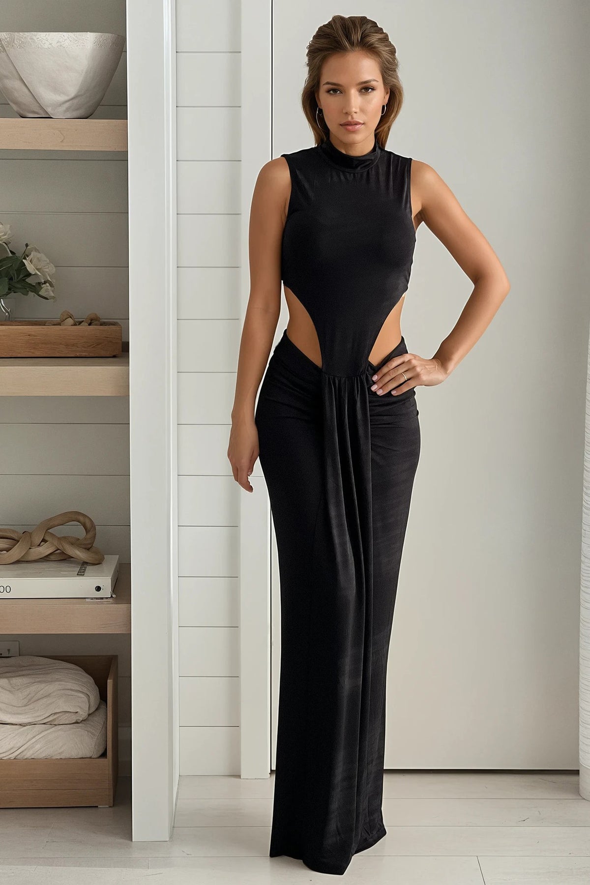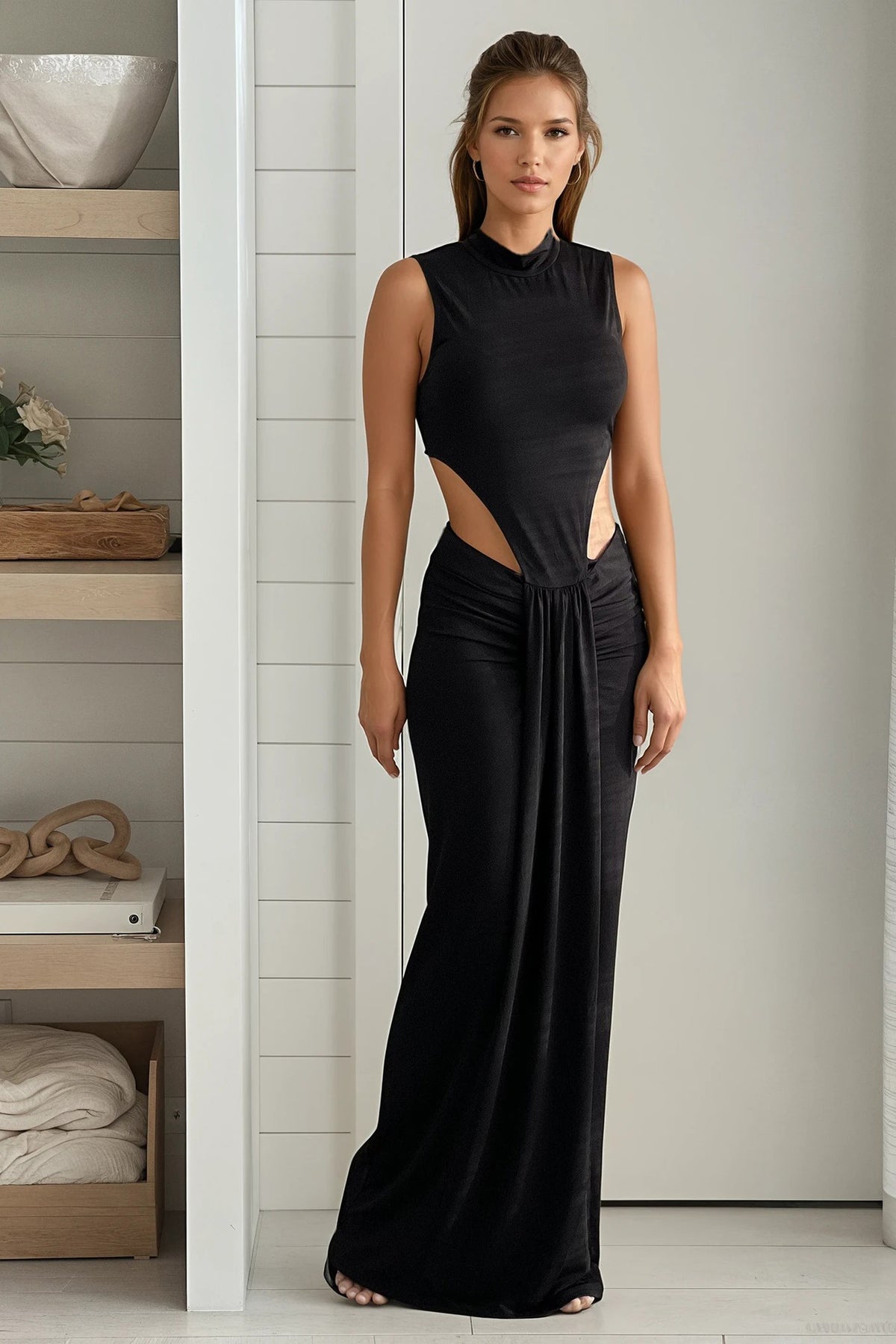 This Black Waist Cut Out Mock Neck Maxi Dress features a sleek mock neckline paired with bold side cutouts that create a flattering, modern silhouette. Designed with a fitted bodice and a flowing maxi skirt, it’s the perfect statement piece for nights out, formal events, or special occasions where you want to stand out.