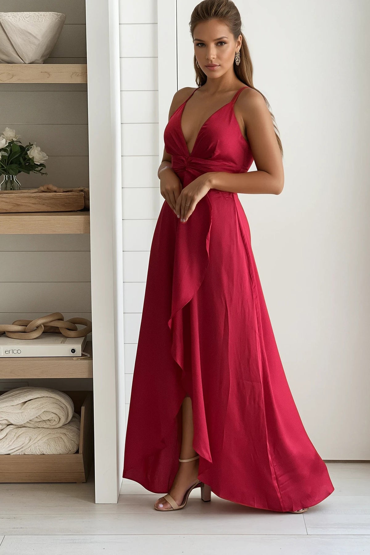 TheBurgundy Satin Maxi Dressis the perfect blend of elegance and allure. Crafted from silky satin fabric, it features a deep V-neckline, delicate spaghetti straps, and a flattering wrap-style front that flows into a graceful high-low hem. Ideal for formal events or romantic evenings, this dress exudes timeless sophistication with a modern touch.
