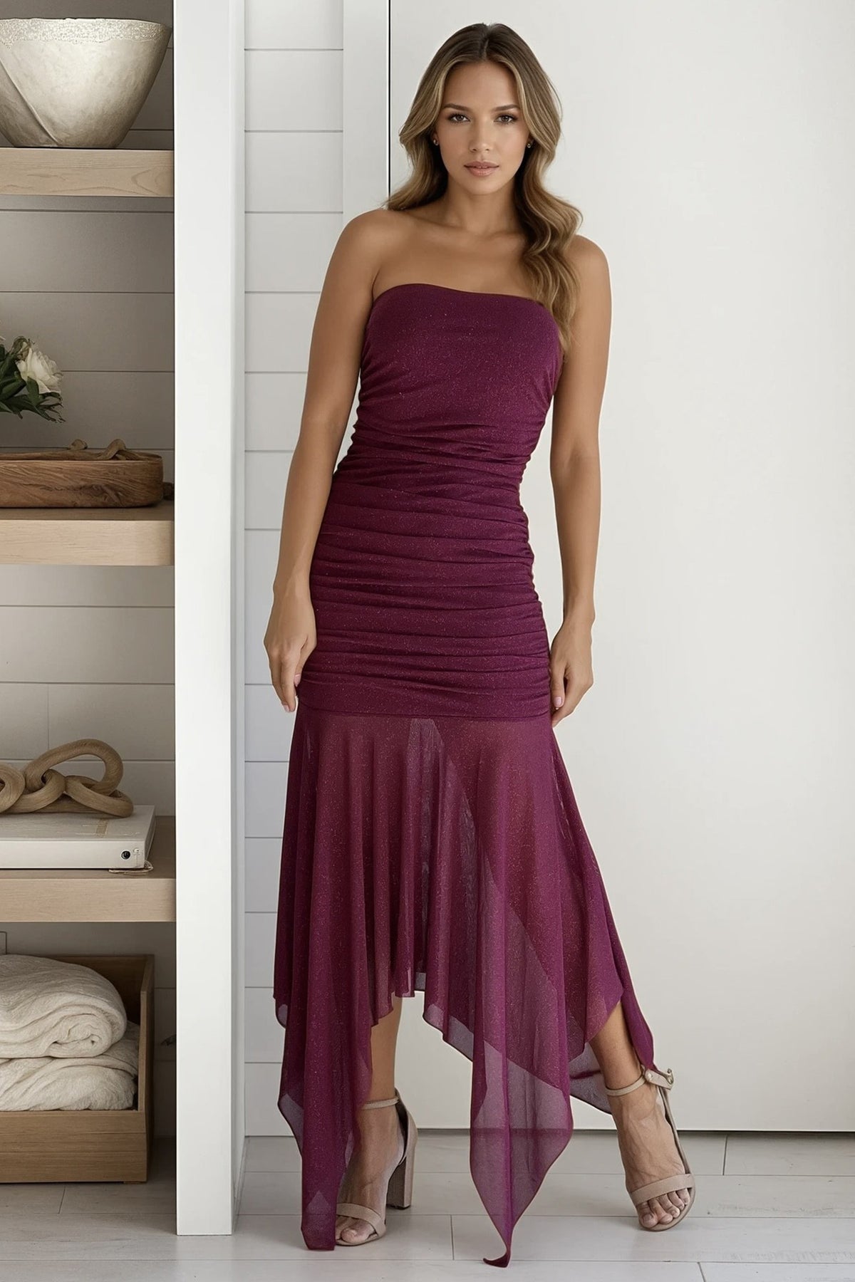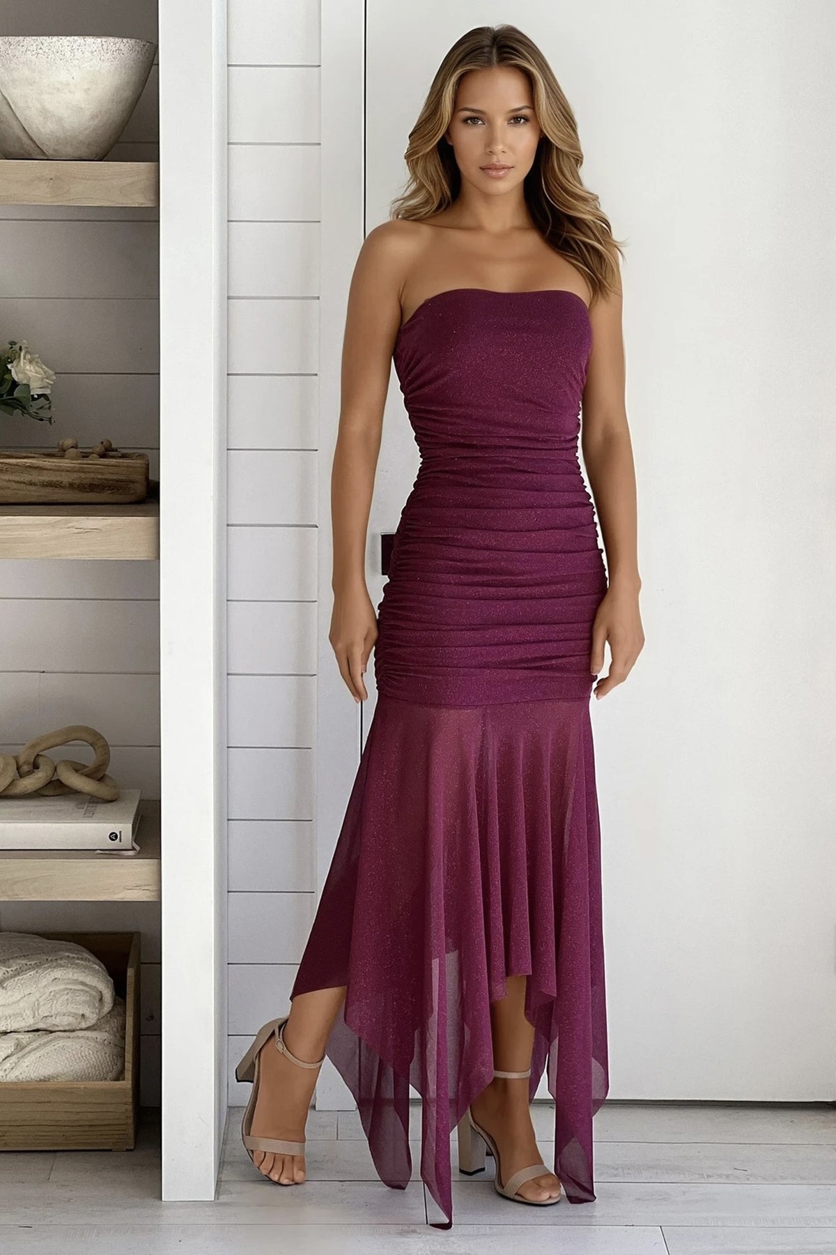 This Magenta Glitter Strapless Dress features a sleek strapless neckline with flattering ruched detailing that hugs the body beautifully. Finished with a subtle shimmer and an asymmetrical flowy hem, it’s a stunning choice for formal events, parties, or any occasion that calls for a little sparkle.