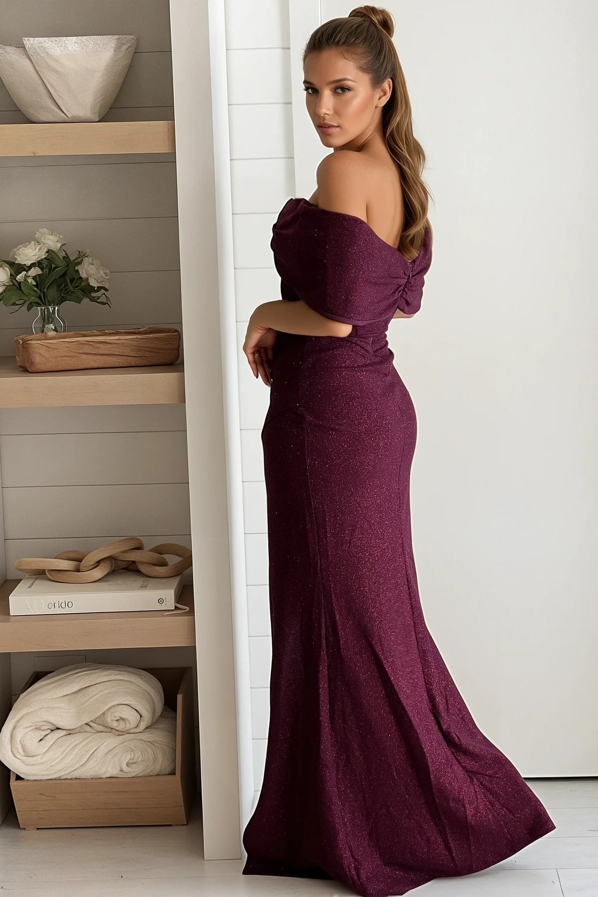 FLAWLESS! You will look amazing in this pretty Maroon Glitter Bow Front Off Shoulder Maxi Dress. We adore the gorgeous color and the stunning off shoulder style with a fantastic bow detail! Perfect for as a bridesmaid dress or for any other special occasion!