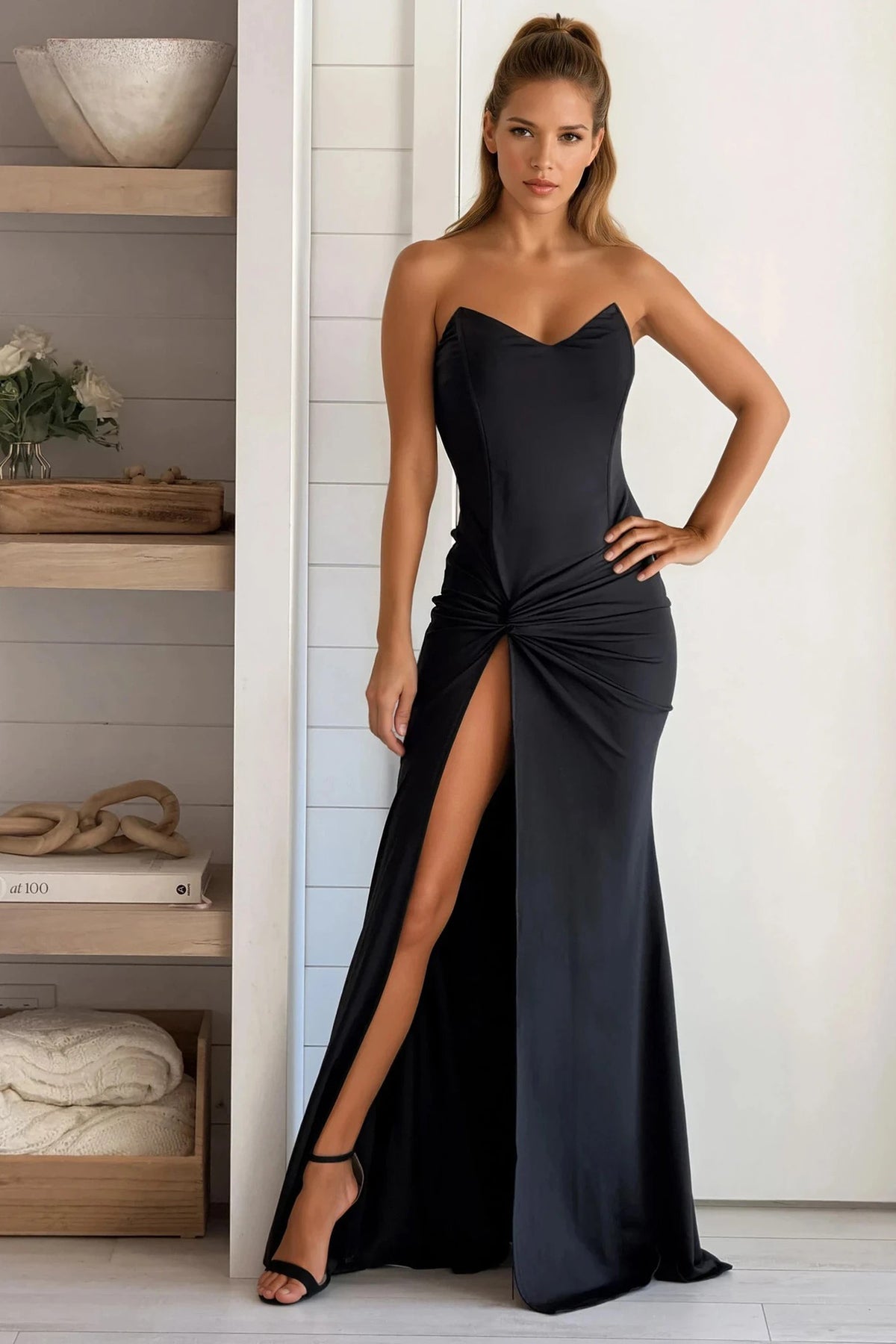 A sleek take on eveningwear, this Black Side Twist Satin Maxi Dress features a clean strapless neckline with a softly twisted waist detail. Finished with a front slit and a luminous satin sheen, it’s effortlessly sophisticated
