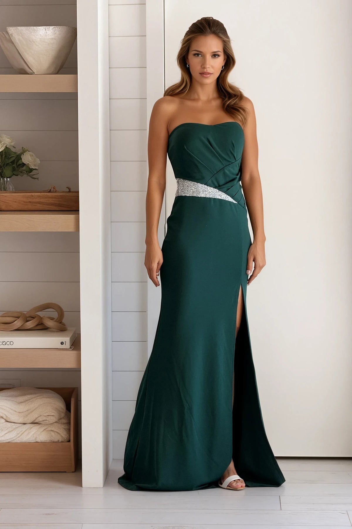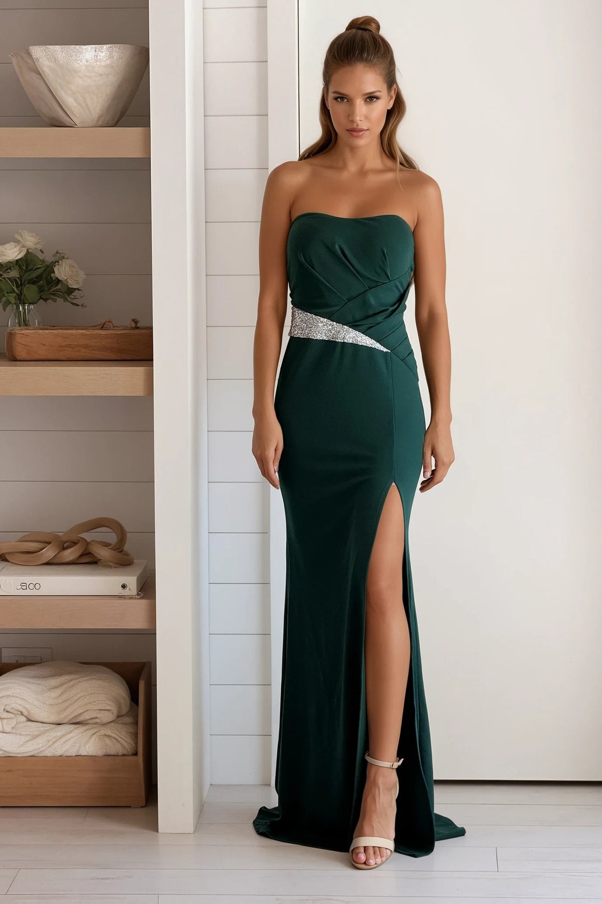 Hunter Green Maxi Dress With Rhinestone Waist Detail And Slit