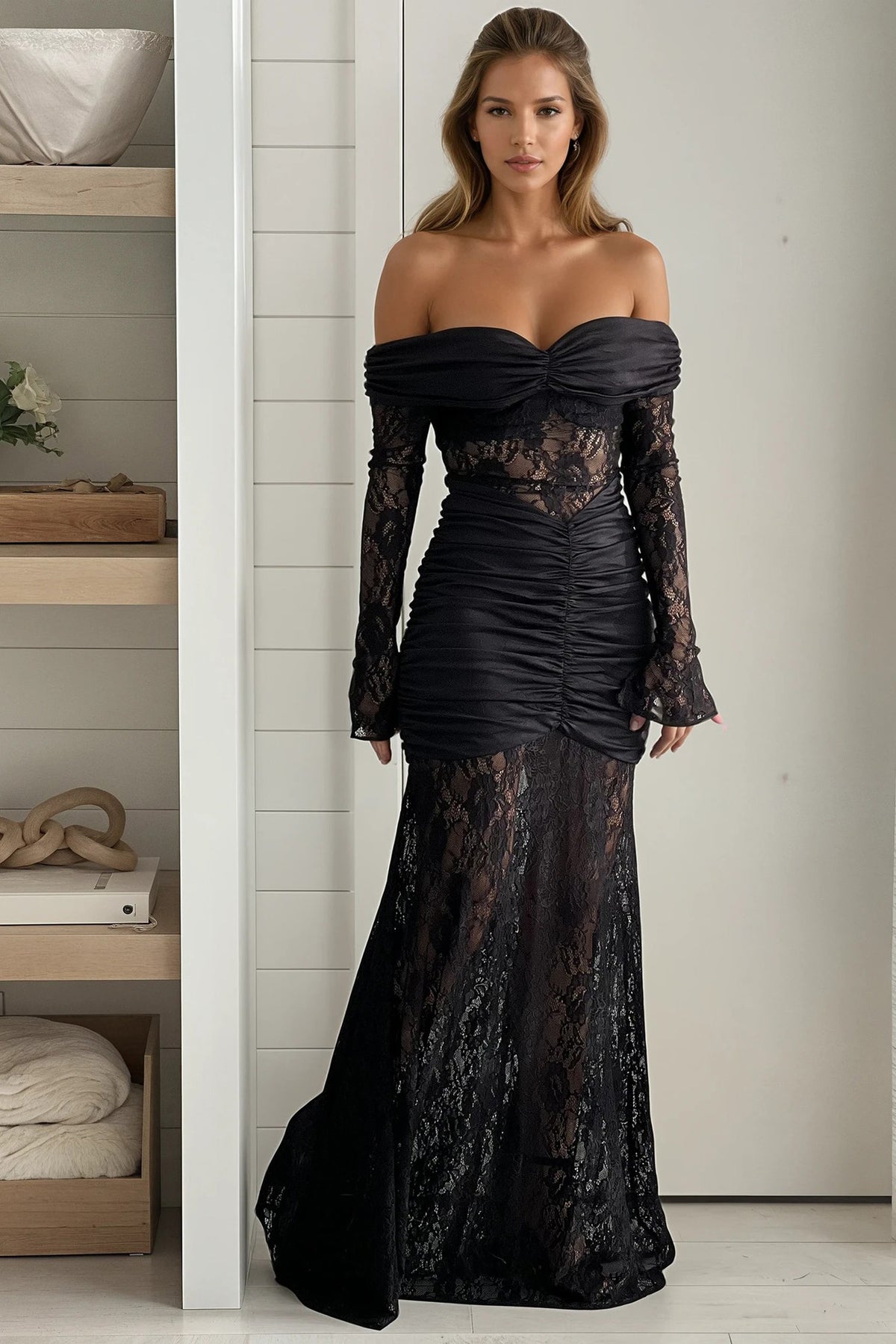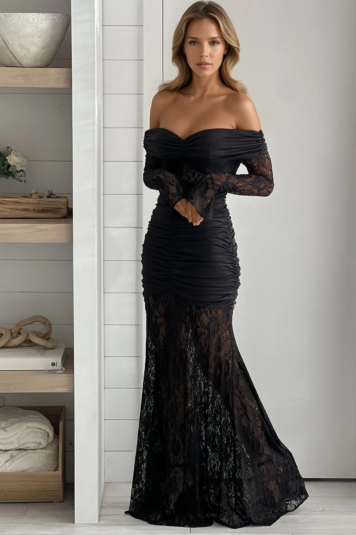 This Black Lace Skirt and Sleeves Maxi Dress features an elegant off-the-shoulder neckline with delicate lace long sleeves for a romantic touch. Designed with a fitted ruched bodice and a flowing sheer lace skirt, it’s a timeless statement piece for formal events, weddings, or evening soirées.