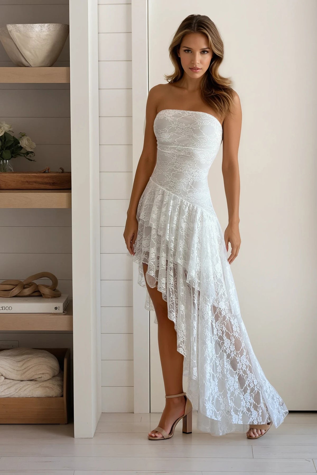 The Ivory Lace Ruffled Asymmetrical Dress delivers soft elegance with a touch of drama. Flowing ruffle accents and a flirty side slit enhance the asymmetrical silhouette, creating graceful movement with every step. Ideal for weddings, cocktail parties, or any moment that calls for a polished yet feminine look.