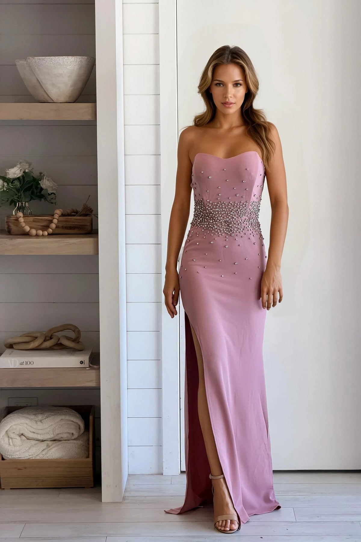 Light Rose Strapless Rhinestone Maxi Dress With Slit
