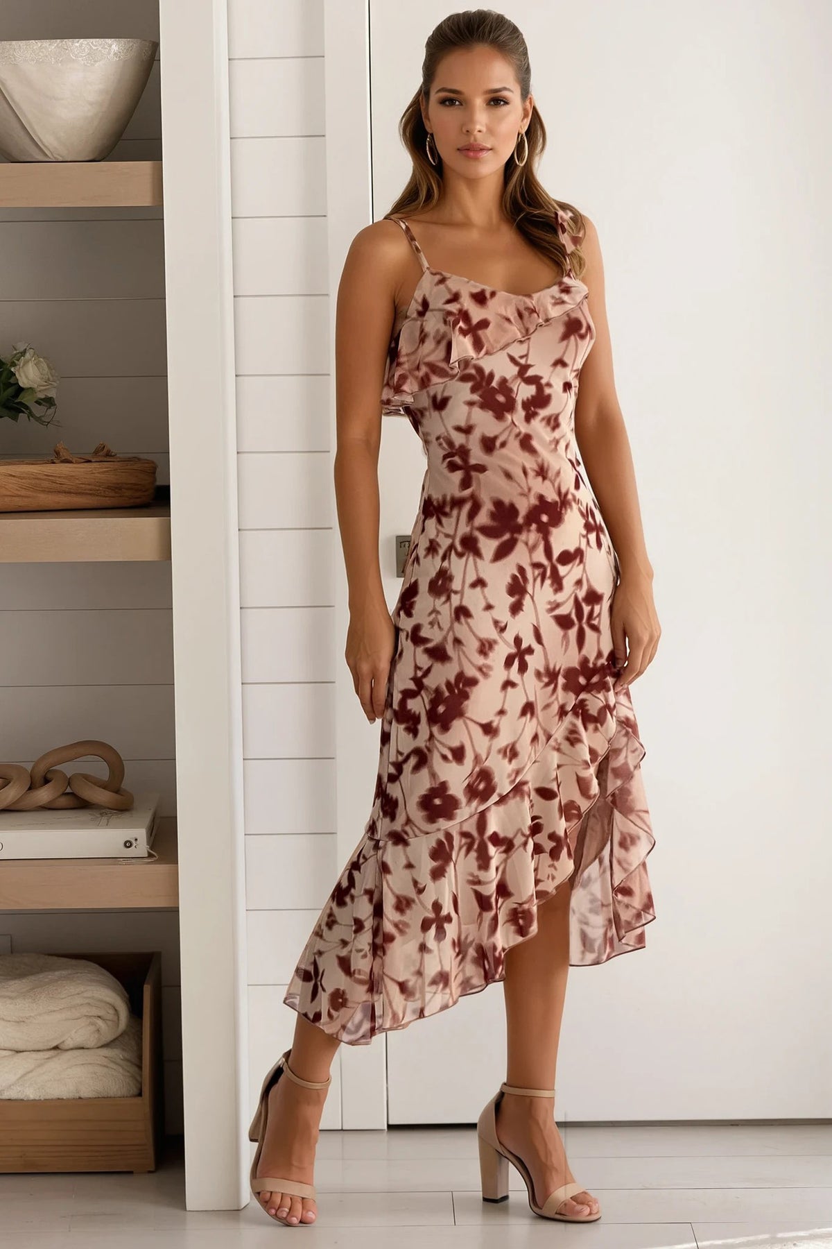 OMG, take a look at this most beautiful Taupe Floral Ruffle Slit Midi Dress that we are offering now at our online dress shop! This prettiest ever midi dress features an amazing floral print and a sassy ruffled side slit!